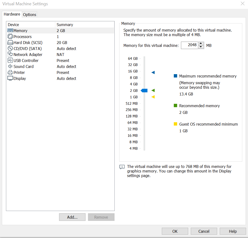 Once you have chosen both of these click on the Import button, and the VM should appear for you! Once you have the VM in front of you, click on the Edit Virtual Machine Settings, here is where the settings for the VM are. Below is an image showing what your VMs settings should be, if needed you can always turn down how much Hard Disk space the VM is taking up, as you would not need too much for this. Once checked out you should be good to go, by clicking Ok, and then click on Power on this Virtual Machine.