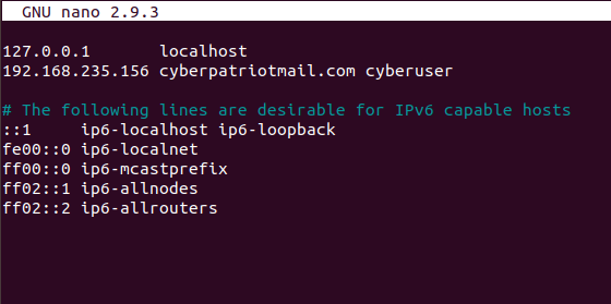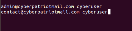 users. We can check this out by doing sudo nano /etc/postfix/virtual, within here we can see that cyberuser has admin@cyberpatiotmail.com and contact@cyberpatriotmail.com set to himself, meaning if someone tries to email that address they cyberuser will receive that