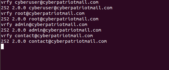 You should see something that looks like this after running these commands in telnet. This tells us that these users and accounts exist within our server. Not only that, but they can try and guess what our naming scheme is based off of some of these names, mainly from contact and admin.