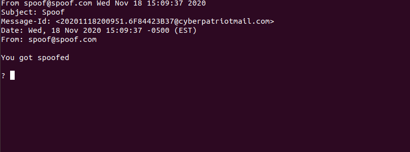 Upon pressing the 1 key, the email should have popped up for us. It is a pretty simple “init” message used to test if the mailbox is properly working. Not only that but we can tell that we sent the email to “yourself”, since the admin account sent an email to contact, which as established earlier, is just cyberuser. If you want to hold onto the message press h, if you want to delete though go ahead and press the h key. If you want to exit out of the mailbox, type in quit.