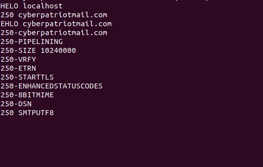command works, but what the name of the server is. There is also EHLO localhost, which shows us various options that our SMTP server