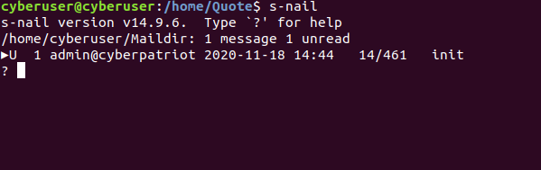 What this command does is we first echo what we want in our message, in this case it is hello. After that we use the | to pipe it into another command, that being the s-nail command. The -s is used for our subject which is quote, and the address after that would be who you are sending the email to, in this case it is the contact email address that will be forwarded to the cyberuser. When you are all set press enter to send the email! Switch back over to cyberuser by typing in exit and then check your mailbox by typing in s-nail and the email should be there waiting for you!