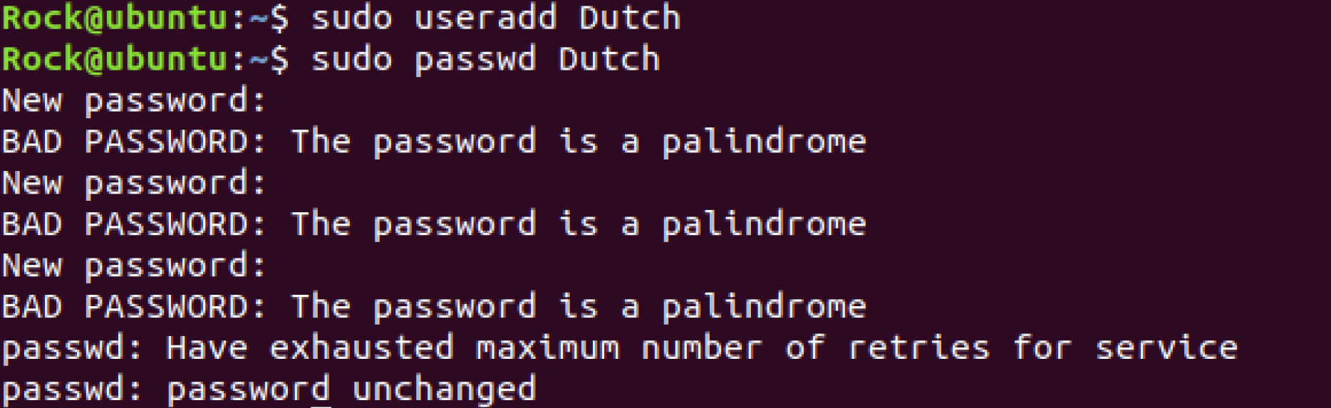 With all of this set, go ahead and do a sudo reboot to apply our policy. After we have done this and our system is back up and running, we can give it an attempt! Let’s make a new user sudo useradd Dutch, and after we do this, let’s try to give him a weak password with a sudo passwd test, and we can then see what happens when we attempt to do this!