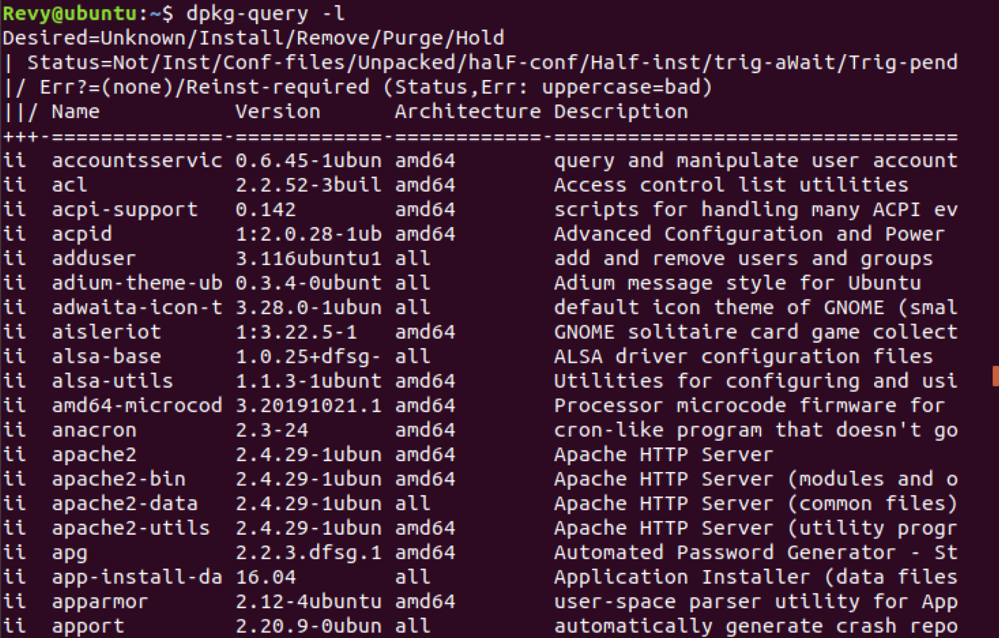 There is one more way you can find some applications that were installed via APT and this is dpkg-query -l. The reason this works is because as mentioned earlier within the documentation, Debian is based on these dpkg packages and APT uses them in a more user friendly way. If we go ahead and run the command, we can see much of the list here again, this time with more advanced information such as the architecture that it was built on as well as a Description for what the application does, which may be helpful if you see a application got installed and you do not know what it does immediately, or if you are suspicious if it is malicious or not. Also, you can combine grep with his command as well in order to try and find packages!