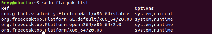 To see all of the Flatpak packages installed on our machine, run the command of sudo flatpak list to see all of them!