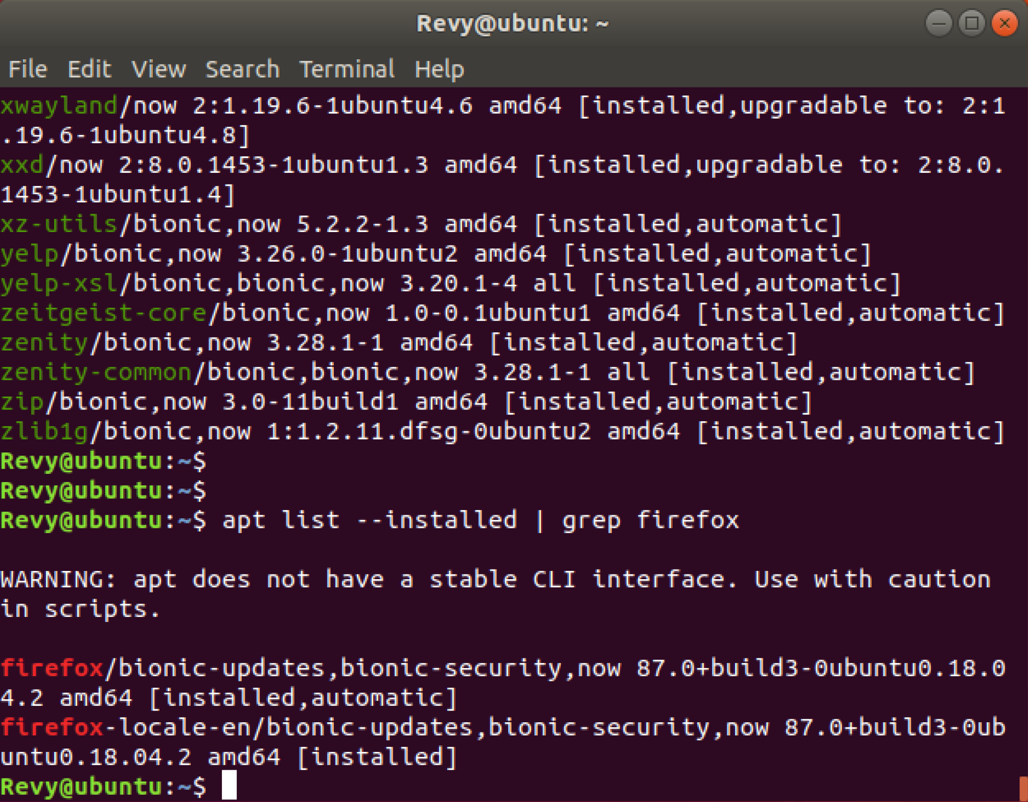If you would want to go ahead and search for a specific package, you can do this by using the grep command to filter out the specific package you may be looking for! Lets go ahead and try to find an application that we know should be installed by default, Firefox. Go ahead and run the command apt list –installed | grep firefox this will run the apt list command previously talked about, while also adding in grep to search for any packages mentioning Firefox directly. It should give you an output similar to this!