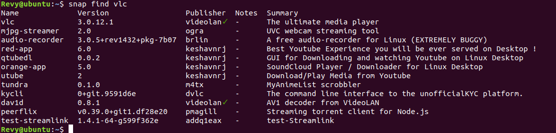 As you can see from above, we found a lot more than just VLC, this is because with the snap find command, it finds all matching content with that search query, however the first one listed is the one that we were looking for. There is a checkmark next to the publisher of the first one, which indicates that they are a trusted publisher!