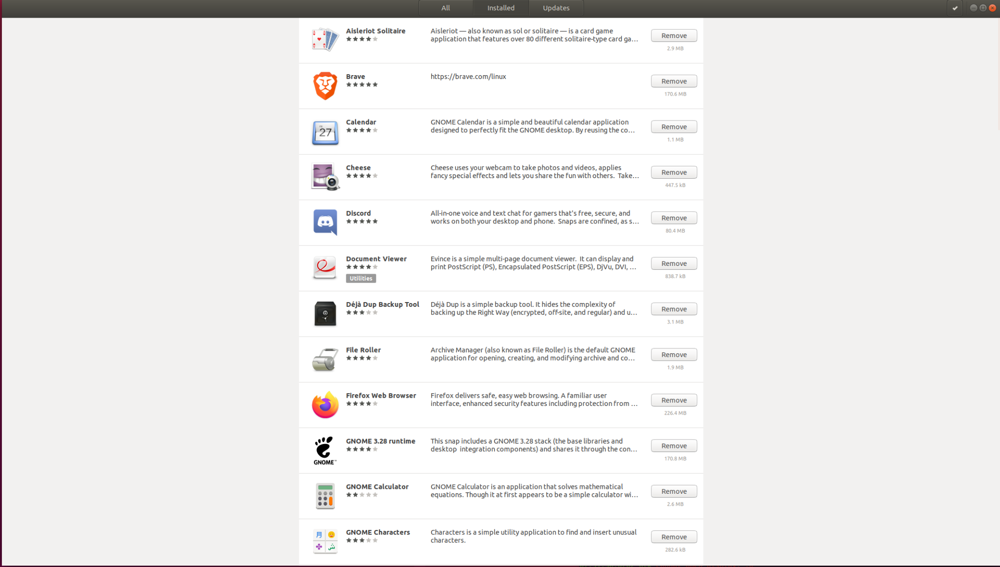 Go ahead and click on this to open it, and when you do you should be greeted with a lovely GUI application store! From here, you can download a whole bunch of software and games to your Linux box! However, the section we are looking for in particular is the Installed option at the top. Go ahead and click on there to see all of these applications, as well as the ones that were installed via Snap!