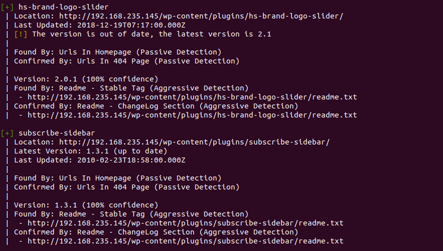 One way to do this, is using our trusty WPScan! Navigate back to your terminal and use this command, you should be able to get most of your plugin information this way, alongside version information and whether it is out of date or not: