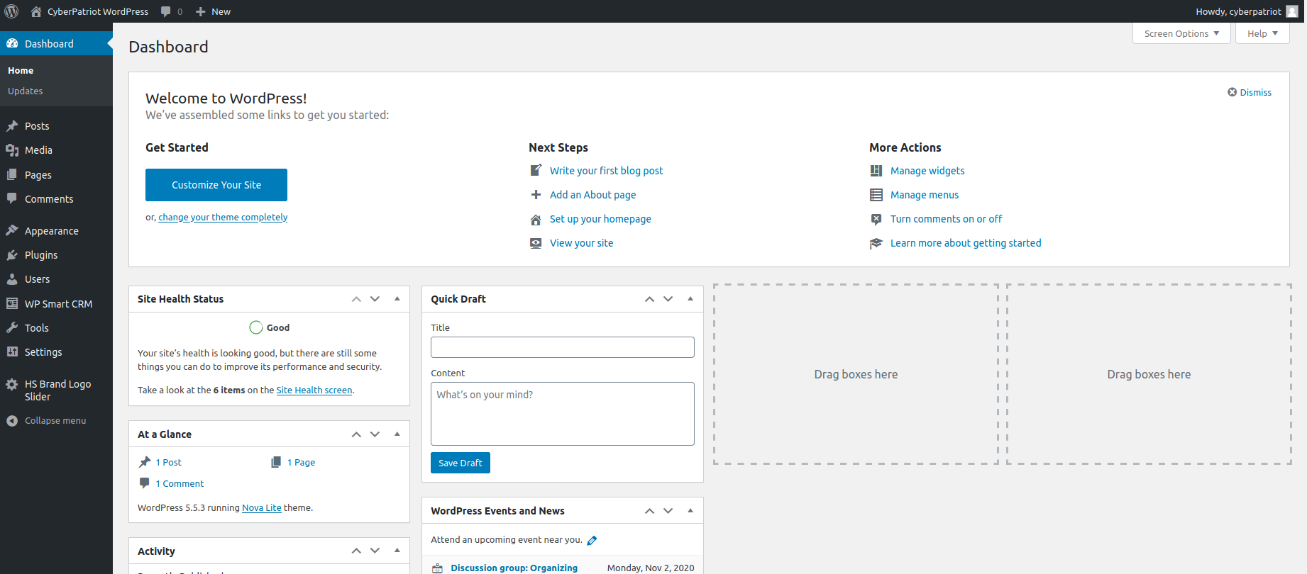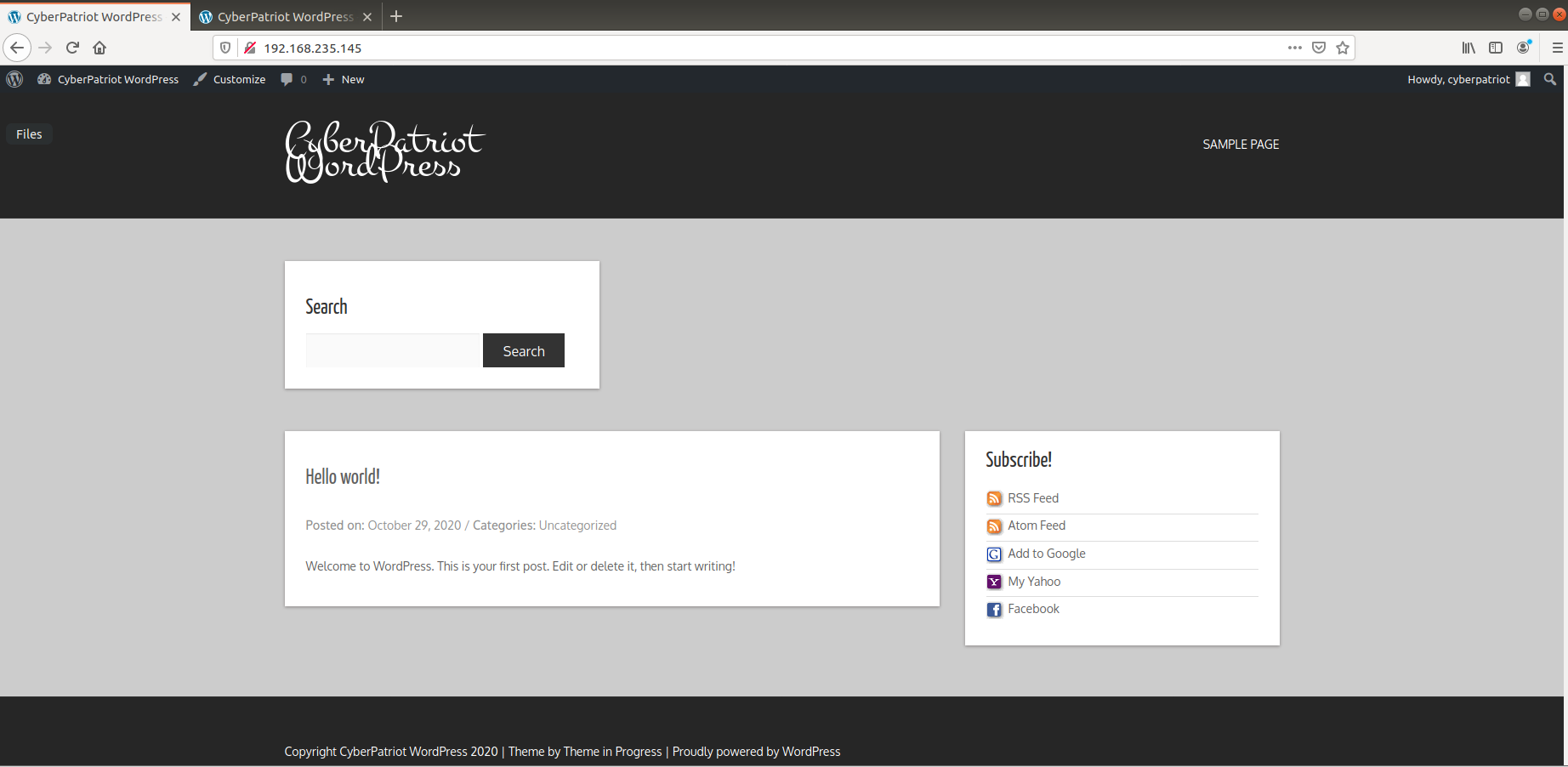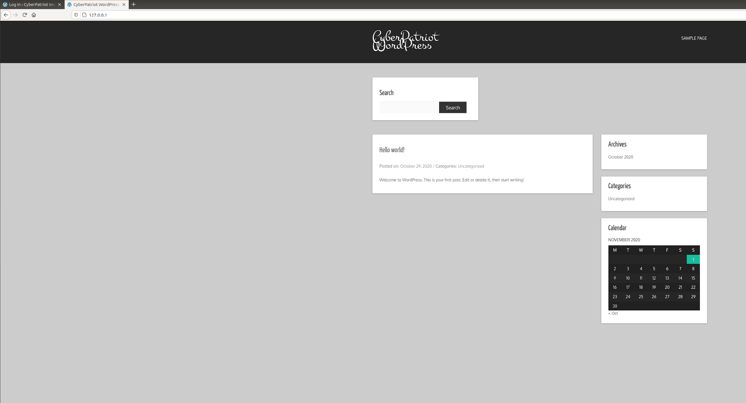 To see the vulnerability however, navigate back to our basic landing page, you can do this by clicking on CyberPatriot WordPress at the top of the page. It should look like this: