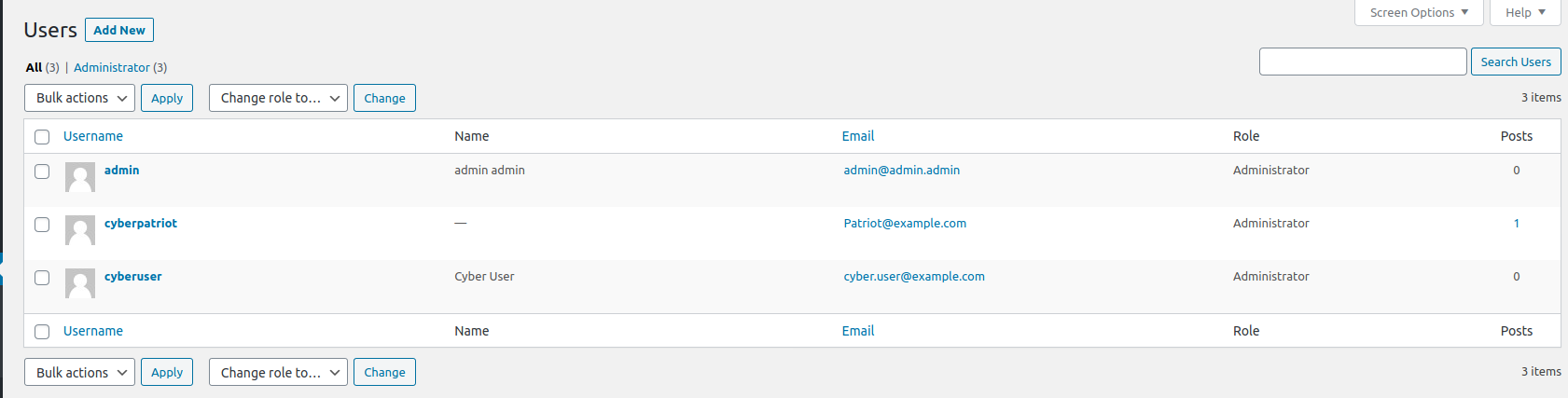 All of this was done under the assumption you are under an administration role, which all users on this server are currently, which is also very unsafe. Not every user needs to be an admin, and if they are, only can possibly set you up for the possibility of future attacks. To combat this, assign roles that you believe will fit each specific user. You can assign these roles under the create user function or the edit user functions we have covered earlier. There are 6 different roles in wordpress, each with different permissions, study them and assign them as you best see fit.