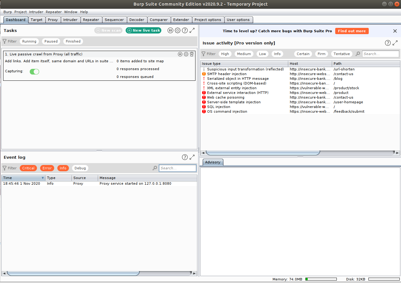 Once inside of there you are going to be typing burp suite into the search bar, the application should show up and go ahead and click on it to open. What is this Burp Suite? This application is one of the most popular penetration testing and vulnerability finding tools around currently, and is most commonly used for checking web application security. We are using the community edition which is free to use. There are a lot of different possible things we can use Burp for, but today we are going to be using this for a very specific reason, to use it as a proxy to intercept and change web traffic.