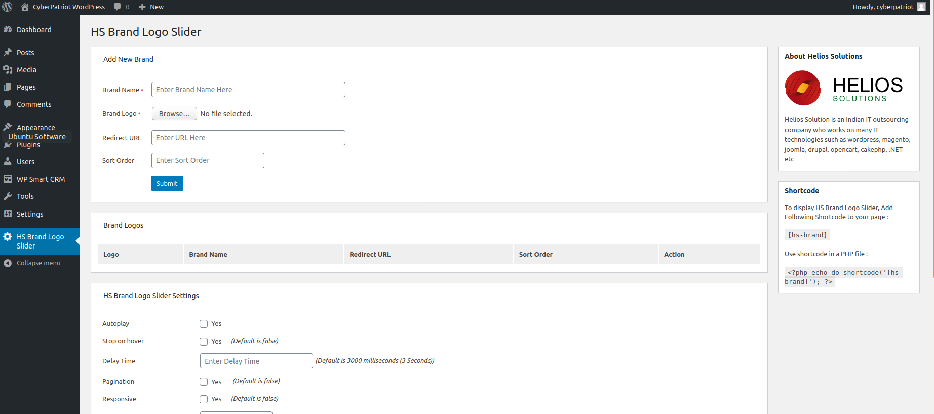 First, let’s start off with our HS Brand Logo plugin. On the right hand side of your screen, click on the HS Brand Logo Slider and you should be brought to a page that looks like this: