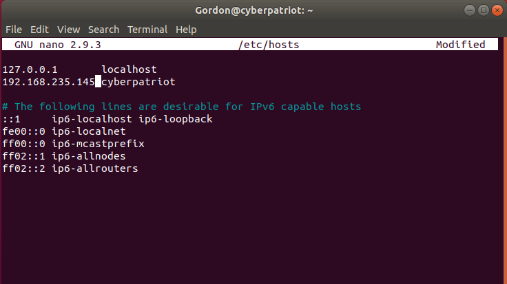 GordonFreeman3CyberPatriot-LinuxPatriot007Once logged in, make sure to run this command to make sure your systems are up to date/your box is connected. Also, make sure to take note of the IP your machine gives you here, you will need to use it a lot in this lab: