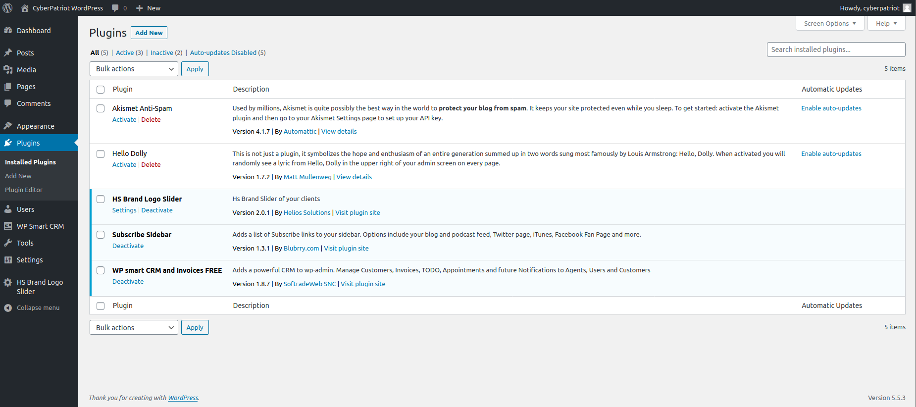 And here we are! We have a total of 5 plugins currently, however the first two in the list Akismet Anti-Spam and Hello Dolly are currently inactive, leaving us with three currently used Plugins. HS Brand Logo Slider, which allows companies to upload logos, Subscribe Sidebar, which adds a list of links to our sidebar listing places where users can follow us on, and WP smart CRM, a free invoice plugin. Here on this page, we can see information about all of our plugins, most importantly our Version number! Not only that, but our Version of our WordPress server!