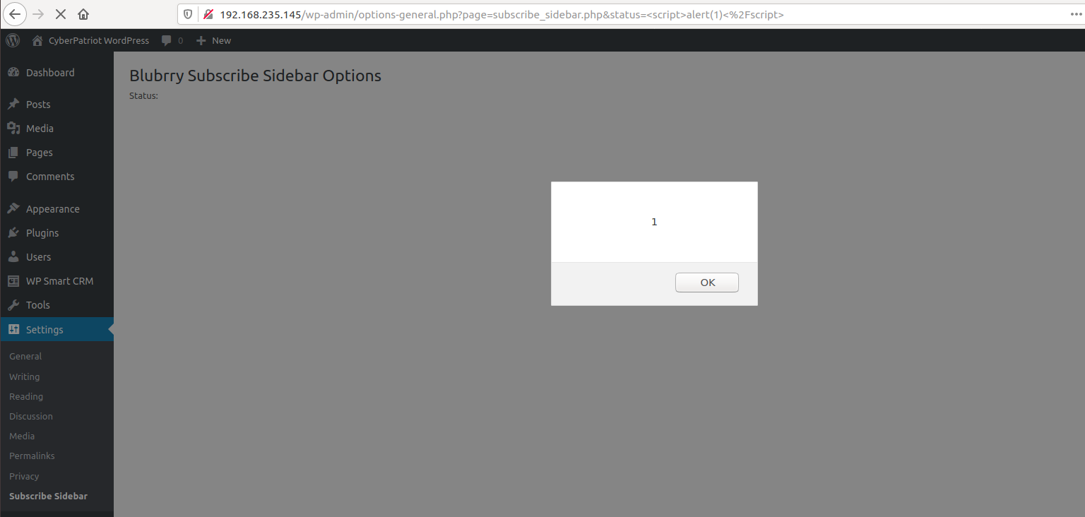 http://cyberpatriot/wp-admin/options-general.php?page=subscribe_sidebar.php&status=<script>alert(1)<%2Fscript>