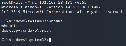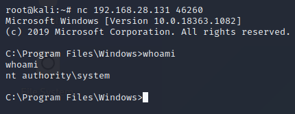 batch script successfully ran Ncat as the `SYSTEM` account over port