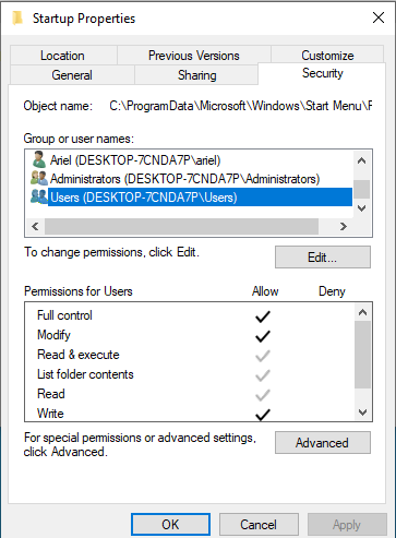 Go back one directory and right-click on the Startup folder and select Properties. Click on the Security tab. Keeping the previous information in mind, what doesn’t look right here?