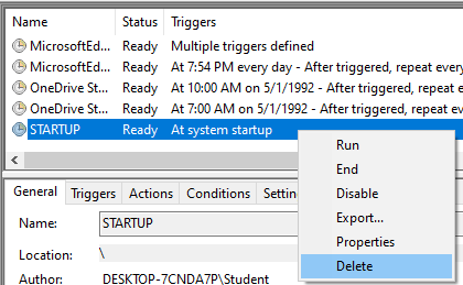 In the Windows Task Scheduler, tasks can be deleted or disabled by right-clicking on the highlighted task:
