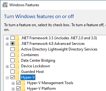 Within this menu, Hyper-V is turned on. Hyper-V is a Windows feature that can be used to run virtual machines similar to VMware or Virtualbox. Sheldon doesn’t need to use Virtual Machines for his job, so this feature can be turned off. Uncheck the box and click OK to uninstall Hyper-V. This may take some time to uninstall and will require a reboot to complete successfully.