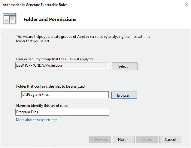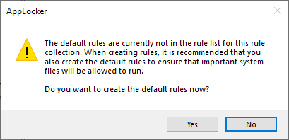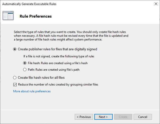 On the next prompt, default options will suffice for this case. By default, AppLocker will look towards the application publisher and digital signature of executables to make determinations. If this is not available, a file hash will be used to identify a file.