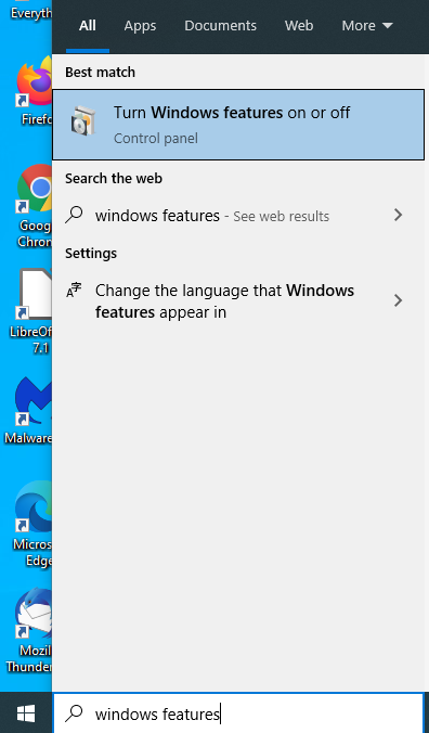 Windows categorizes built-in optional features as another category in system settings. These are also additional pieces of software that can be installed on top of Windows. To browse optional features that are installed on Sheldon’s machine, you can search for Windows Features within Control Panel in the Windows Start Menu: