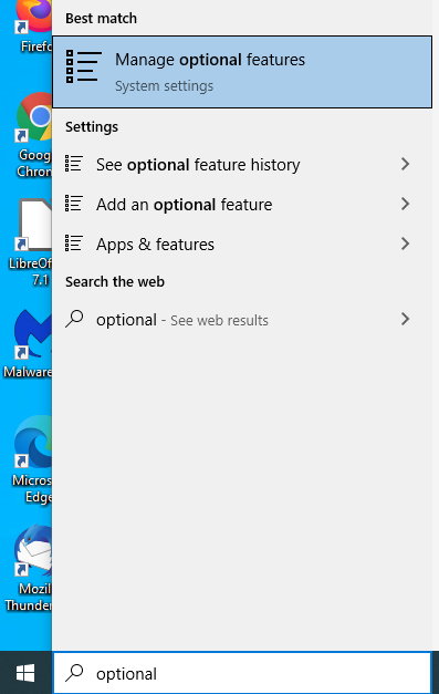 Similar to the previous method, there is a separate similar settings page in Windows 10 for optional features that can be accessed via a search in the Windows Start Menu: