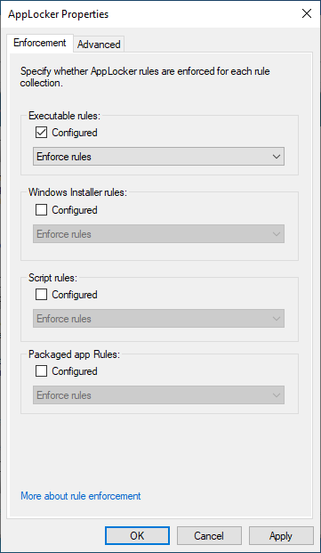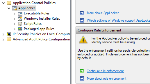 To enforce the rules that were just created, go back to the main AppLocker pane, and select Configure rule enforcement in the right pane:
