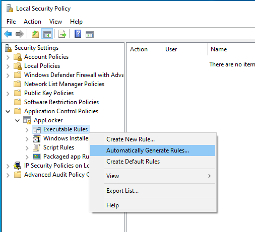 Within this editor, AppLocker can be configured to allow or block certain executables from running on the computer. In larger organizations, rules can be crafted and deployed at scale to suit the needs of various groups of people. For example, a set of rules can be configured to allow editing software for marketing employees, but different sets of rules for sales software for the sales department. While this can be deployed via Active Directory, AppLocker rules can be set up from a known good baseline like the one that was just created by removing unneeded software. Right click on Executable Rules and click Automatically Generate Rules: