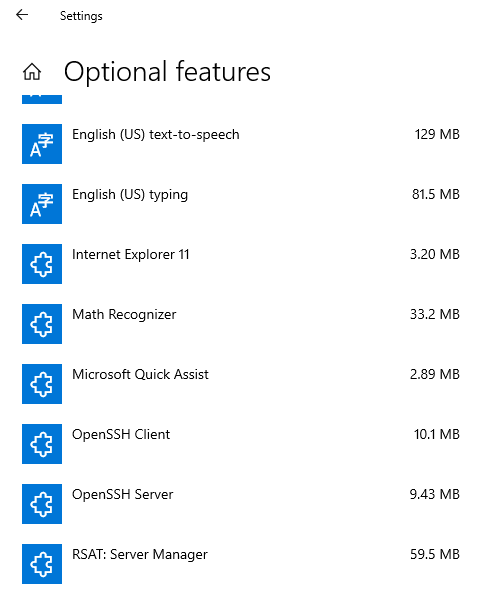After scrolling through these features, you should see OpenSSH Client and Server, and RSAT: Server Manager: