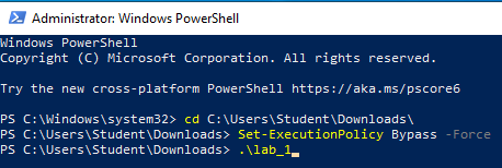 Change directories to the folder containing the PowerShell script. This will vary depending on the location of the file and the username on the Virtual Machine. Set the execution policy to allow the script to run, and then run it with the dot-backslash command: